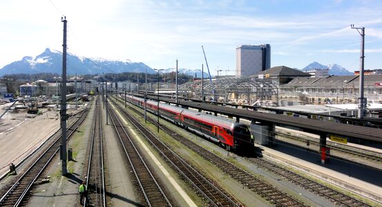 Ein ÖBB railjet im Bereich der Haltestelle Salzburg Kasern.
