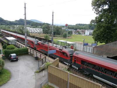 Nach Süden verkehren railjets auf der Salzburg-Tiroler-Bahn bis Bahnhof Schwarzach-St. Veit und von dort auf der Tauernbahn nach Klagenfurt in Kärnten.