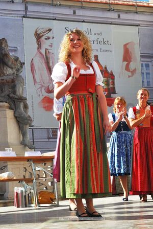 Die G’schicht geschah am Domplatz, der am Nachmittag des 24. September 2013 in wunderbares, herbstliches Sonnenlicht getaucht wurde. Ja fast kitschig war das Licht und ebenso kitschig viele Dirndln (die Kleidung ist hier gemeint), die da am Rupertikirtag herumliefen. Zumindest ein solches hatte sich auch unter jene zehn Teilnehmerinnen verirrt, die bei der Wahl des schönsten Dirndls im Dirndl mitmachten. Wie merkte doch eine Besucherin beim Auftreten jenes Dirndls an: Stiefel und Handtasche sind wirklich im selben Farbton (einem grellen Grün).