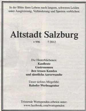 In der Samstagausgabe der Salzburger Nachrichten (28. Juli 2012) war dann eine viertelseitige "Todesanzeige der Salzburger Altstadt" zu sehen. Die Rahofer Werbeagentur hatte diese Anzeige geschalten und auf eine Facebook-Seite um "Wortspenden" gebeten. Diese Facebook-Seite wurde jedoch bereits am Samstagmittag wieder abgeschalten, da die ersten Meldungen sich negativ über die Todesanzeige, das Verhalten der Salzburger Innenstadtkaufleute und deren Aktionen aussprachen. Anstelle zu jammern hätten sie positive Stimmung verbreiten, auf die Möglichkeiten der Altstadtgaragen hinweisen, das Geld für Plakate gegen die Politiker für kreativere Dinge verwenden können, waren die Meinungen bis zur Abschaltung.