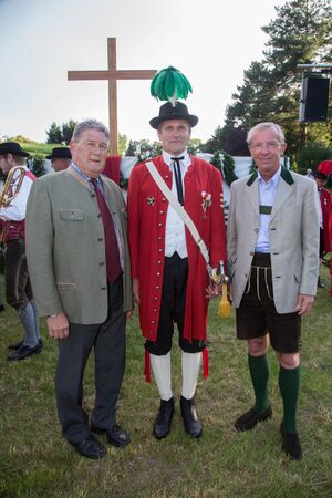 Anlässlich des Jubiläumsfests 540 Jahre Jakobischützen, im Bild von links: Bürgermeister der Gemeinde Puch bei Hallein Helmut Klose, Hauptmann Anton Hager und Landeshauptmann Wilfried Haslauer junior.