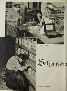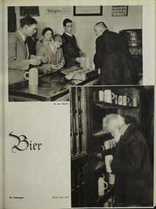 Blicke in das Augustiner Bräustübl zum Verkauf von Radi, Eier und Laberl sowie der Schrank mit den Bierkrügen im Festspielsommer 1934.