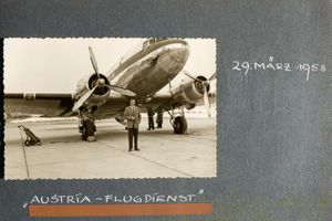 Austria Flugdienst Erstlandung am Flughafen Salzburg, nur einen Tag nach ihrer Gründung. Hier mit dem Journalisten Hans Heinrich Welser am 29. März 1958.