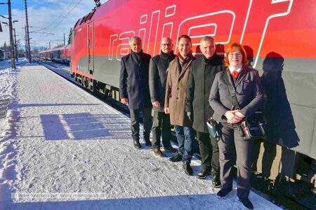 10. Dezember 2017, sie eröffnten offiziell die neue Zugverbindung, von links: Bürgermeister der Stadt Neumarkt am Wallersee a. D. Dr. Emmerich Riesner, Dipl.-Ing. (FH) Christian Spanner MSC, Leiter Regionalmanagement Salzburg; Bürgermeister der Stadt Neumarkt am Wallersee Dipl.-Ing. Adi Rieger und Landtagsabgeordneter Hofrat Dr. Josef Schöchl mit einer Zugbegleiterin des railjets 549 um 09:30 Uhr nach Wien.