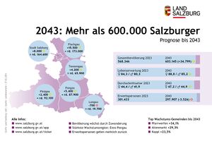 Erstmals seit 105 Jahren, seit dem Ende des Ersten Weltkriegs zeigte das Jahr 2023 eine negative Geburtenbilanz in Salzburg. Voraussichtlich 2040 werden erstmals mehr als 600 000 Menschen im Land leben. 2023 lebten im Land Salzburg 448 391 Personen, die im Inland geboren wurden und 119 955, die im Ausland geboren wurden, das sind 21,1 % der Salzburger Bevölkerung. Derzeit sind die Salzburger im Schnitt 43,2 Jahre alt (Frauen 47,2 Jahre und Männer 44,9 Jahre). In 40 Jahren werden wir im Durchschnitt 46,5 Jahre alt sein, also um rund 3,3 Jahre älter als heute. Auch die Lebenserwartung steigt. Ein Mädchen das 2022 geboren wurde, wird im Schnitt 84,3 Jahre alt, ein Bub 80,3 Jahre. 2042 Neugeborene dürfen dann schon mit 85,2 Jahre (Männer) und 88,8 Jahren (Frauen) an durchschnittlicher Lebenszeit rechnen.[2]