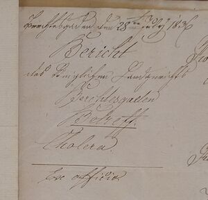 Ende des Jahres 1848 verbreitete sich die Cholera von Galizien, der Bukowina und Ungarn ausgehend nach Westen. Diese entwickelte sich auch später in den mehr westlich gelegenen Kronländern. An der Schwelle des Jahres 1849 zeigte sich die Cholera wieder in Wien und zwar Anfangs nur unter dem Militär.[6] Auch in Salzburg wurden Vorkehrungen getroffen wie das "Commissions-Protocoll", aufgenommen in dem magistratischen Sitzungssaal zu Salzburg am 21. September 1848, betreffend die Vorkehrungen gegen die herannahenden Cholera Epidemie, zeigt.[7] Salzburg blieb auch von diesem Ausbruch verschont.