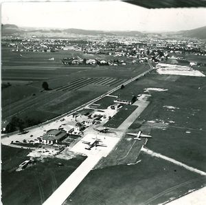 - 20. Dezember: Die Kollaudierung des neuen Flughafengebäudes erfolgt, obwohl der Innenausbau noch nicht ganz beendet war. Flugleitung, Funk und Wetterdienst beziehen die geheizten Räume. Noch im Bau befindet sich das Tanklager für 3 000 Liter Benzin und Benzol, dem damals bevorzugten Treibstoffgemisch.