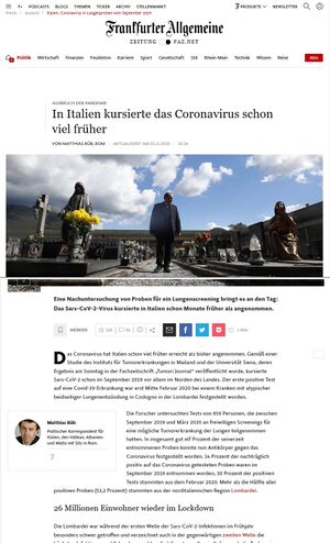 "[...] gemäß einer Studie des Instituts für Tumorerkrankungen in Mailand und der Universität Siena, deren Ergebnis am Sonntag [15.11.2020] in der Fachzeitschrift "Tumori Journal" veröffentlicht wurde, Sars-CoV-2 schon im September 2019 vor allem im Norden des Landes kursierte[..]"