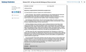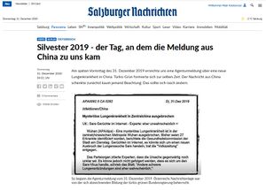 Am 31. Dezember 2019 tauchte die erste APA-Meldung bei den Salzburger Nachrichten auf, in der von einer in Wuhan in China ausgebrochenen Lungenkrankheit die Rede ist, an der bereits 8 000 Menschen in rund 30 Ländern erkrankt sein sollen.