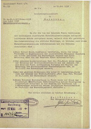 Nach dem Anschluss Österreichs wurden von den Nationalsozialisten alle Ehrenbürgerurkunden aus der Zeit von 1933 bis 1938 für ungültig erklärt, da diese nach Meinung der neuen Machthaber unter einem "Unrechtsregime" ausgestellt wurden. Aus diesem Grund erging an alle Salzburger Gemeinden die Aufforderung die Ehrenbürgerurkunden aus der Zeit von 1933 bis 1938 einzuziehen und an die Landeshauptmannschaft unter dem neuen Landeshauptmann Anton Wintersteiger einzusenden. Dr. Hubert Schopf vom Salzburger Landesarchiv geht davon aus, dass diese eingezogenen Ehrenbürgerurkunden dann bei der Landeshauptmannschaft vernichtet wurden.