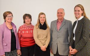 Hofrat Robert Luckmann bei seiner Verabschiedung in die Pension im Dezember 2018; zum Pensionsantritt gratulierten: Herlinde Lugstein, Beate Fürstauer (beide Stabsstelle Öffentliche Bibliotheken und Bildungsmedien), Eva Veichtlbauer (Abteilungsleiterin Kultur, Bildung und Gesellschaft; Bildmitte), Landesrätin Andrea Klambauer.