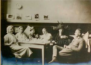 Im Reservelazarett in der Andrä-Schule während dem Ersten Weltkrieg. Bildmitte Dr. Franz Schuchter, ganz rechts ein Dr. Beuerlein, wahrscheinlich Dr. med. dent. Heinrich Beuerlein.