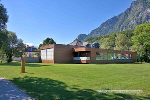 Der 2010 eröffnete Erweiterungsbau des Gemeindeamts Grödig. Davor ein Teil des Gemeindeparks.