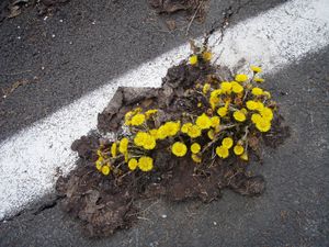 In den Monaten Februar und März – je nach Standort – öffnen sich die ersten Huflattichblüten und werden umgehend von den ersten Insekten angeflogen. Auch für Menschen ist der Huflattich mit seinen goldgelben Blüten ein mit Freude entdeckter Frühlingsbote. Erst nach dem Verblühen zeigt die Pflanze nach dem Verlängern der Blütenstände ihre namensgebenden hutförmigen Blätter. Der Huflattich ist durch seine langen Ausläufer sehr gut an bewegten Schutt und an Geröll angepasst. Wie die nebenstehende Aufnahme zeigt, ist für den Huflattich auch kein Asphalt zu fest. Es verwundert daher nicht, dass die Pflanze in ganz Europa verbreitet ist und bis in Höhen von über 2 000 m ü. A. steigt.