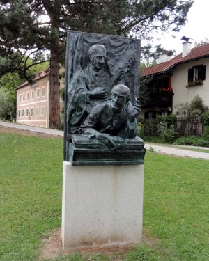 Die fehlerhafte Franz Xaver Gruber und Joseph Mohr-Darstellung von Josef Mühlbacher neben der Stille Nacht Kapelle in Oberndorf bei Salzburg: Gruber spielte niemals Gitarre - diese spielte Mohr. Dies ist in mehreren Quellen belegt.[1] Möglicherweise brachte der Enkel von Gruber, Prof. Felix Gruber dieses Gerücht auf, da er zeitgenössischen Berichten nach mit zur Laute seines Großvaters beim Singen am Grubergrab zitiert wird.