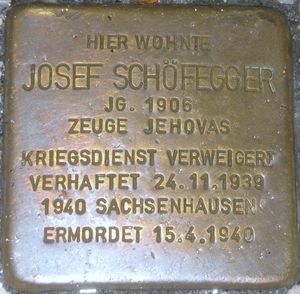 Josef Schöfegger (* 4. August 1906 in Feldkirchen bei Mattighofen im Innviertel, OÖ.; † 15. April 1940 im Konzentrationslager Sachsenhausen ermorde)) war als Zeuge Jehovas ein Opfer des Nationalsozialismus.