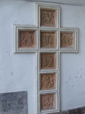 Für das Grab seiner Mutter Mathilde Thorak (* 1853; † 1943) schuf Josef Thorak auf dem Friedhof von St. Peter das Skulpturenensemble Pietà. Die Darstellung führt die Kreuzabnahme, die Beweinung Christi und die Grablegung in gleicher Weise vor Augen. Die Gottesmutter Maria hält ihren Sohn auf dem Schoß. Links kniet Maria Magdalena, rechts der Jünger Johannes – in dessen jugendlich-kraftvoll-männlicher Gestalt sich der Bildhauer selbst zu verewigen getrachtet hat.