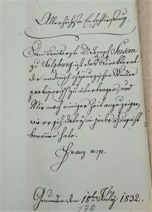 Von 1833 bis zu seinem Tod 1844 war Dr. Susan Kreisarzt von Salzburg, Studiendirektor des medizinisch-chirurgischen Studiums und auch korrespondierendes Mitglied des k.k. Vereins der Ärzte in Wien.[19] Im Juli 1832 erhielt er von Kaiser Franz die Erlaubnis das "Ehrenamt eines Direktors der medizinisch-chyrurgischen Studien an dem Lyceum zu Salzburg" zu übernehmen (also vermutlich unentgeltlich). Kaiser Franz merkte an, dass es ihm nach einiger Zeit anzuzeigen sei, "wie er sich dabey in jeder Hinsicht benommen habe" (siehe Abbildung).