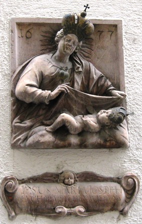 - Eine der Plainer Madonnen in der Stadt Salzburg als Relief aus Stein am Haus Judengasse Nr. 8.