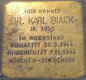 Zum Andenken an Karl Biack wurde am 2. Juli 2014 in der Prälat-Winkler-Straße Nr. 7 ein Stolperstein verlegt.