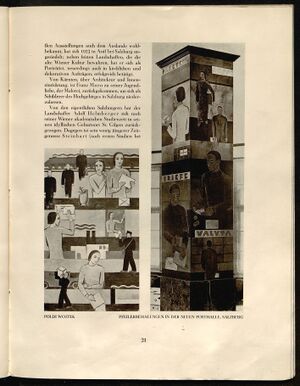 Wie hat es ausgesehen? Das "Salzburger Volksblatt" berichtete am 6. Juni 1930 über "Das neue Hauptpostamt" von "gediegener Ausstattung mit edlem Material" und hebt Poldi Wojteks Malereien hervor, "die in farbenfreudigen Bildern verschiedene Motive aus dem Postbetrieb und aus der Stadt" darstellten. Diese Fresken wurden Nikolaus Schaffer zufolge im Dritten Reich übermalt. Sie taugten – wie ihr von 1938 bis 1945 entferntes Festspiel-Logo also explizit nicht als "NS-Kunst".