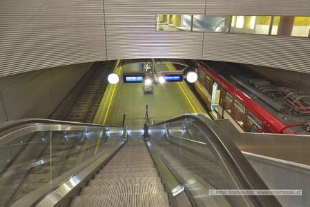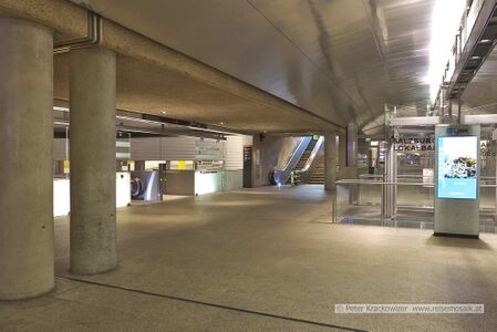 - Juni 2023: Hier befindet man sich auf einer Zwischenebene zwischen der Halle des Hauptbahnhofes und des Lokalbahnhofs. Im Hintergrund der Ausgang in die Parkgarage Salzburger Hauptbahnhof.