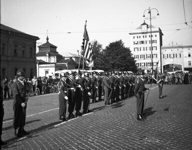 - Generalleutnant William Howard Arnold verlässt Salzburg (3. Oktober 1955). Die Aufnahme wurde am Südtiroler Platz vor dem Gebäude des Salzburg Hauptbahnhofs gemacht. Rechts die Gebäude gehörten zum Postamt Salzburg Hauptbahnhof, links zum Salzburg Lokalbahnhof.