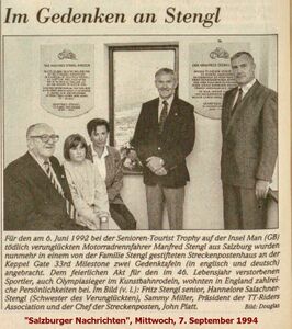 - 26. April 1970: Erstmals fand der "Große Preis von Österreich" für Motorräder, das sogenannte 1. Mai Rennen am Salzburgring statt. Dabei fuhr Stengl mit seiner Yahama mit 01:32,6 min. (= 164,73 km/h) Klassenrekord.[22] Stengl hielt übrigens auch noch den Rekord in der 250-cm³-Klasse am Salzburgring mit 01:43,2 min (= 150,48 km/h) auf Aermacchi [allerdings muss diese Angabe in den SN noch überprüft werden, da Stengl vor 1970 ja nur 350 cm³ fuhr][23]