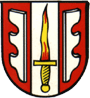 Im roten Felde ein silberner, von einem aufrecht gestellten flammenden Schwert mit goldenem Griff belegter silberner Pfahl, der beiderseits von je einem auswärts gekehrten silbernen Spießträger begleitet ist.