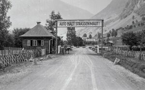 "Auto Halt! Straßenmaut!" Mauthaus Ferleiten an der Großglockner Hochalpenstraße. Eine Aufnahme kurz nach der Eröffnung 1935.
