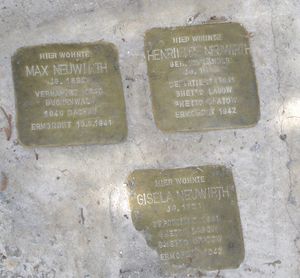 Zum Andenken an Max, Henriette und Gisela Neuwirth wurden am 22. Juli 2010 vor der Arenbergstraße Nr. 33 drei Stolpersteine verlegt.
