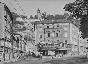 - das Zeitkartenbüro der Salzburger Stadtwerke, es wurde am 20. Dezember 1954 eröffnet; man kaufte sich für eine "Zeitkarte" monatlich eine Marke, die zum Benützen der Stadtbuslinien berechtigte; dort erhielt man auch die – noch selbst zu bezahlenden – Schülerfahrausweise, ebenfalls jeden Monat mit einer Marke zu bekleben; weiters war es Aufenthaltsraum für die Busfahrer, die am Hanuschplatz Pausen machten;