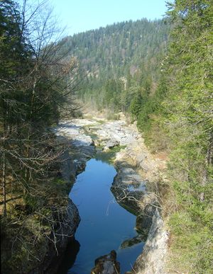 Unweit der Einmündung, in der Nähe des ehemaligen Schlosses von der Alben,[2] befand sich einmal Halleins sog. "kleiner Holzrechen" (siehe Griesrechen).[3] In ihm verfing sich damals getriftetes Rundholz, z. B. das aus Hintersee.
