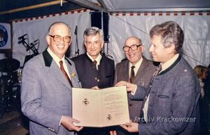 Anlässlich der Verleihung des SAMTC-Sportehrenzeichen in Gold mit Brillanten an den Motorradprofessor Dr. Helmut Krackowizer zu dessen 60. Geburtstags. Im Bild von links: Dr. Krackowizer, Ernst Kretz (Direktor SAMTC) und ganz rechts Othmar Horwath sowie eine nicht näher bekannte Person;