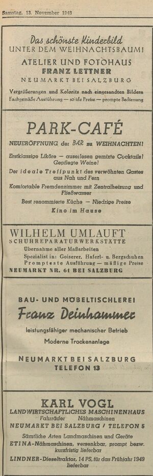 Am Montag, den 6. Jänner 1936 stand im "Köb"-Ausflugsprogramm[1] Ausflug ins Park-Café in Neumarkt (Musik und Tanz), Abfahrt 14:30 Uhr, Fahrpreis 2,70 S