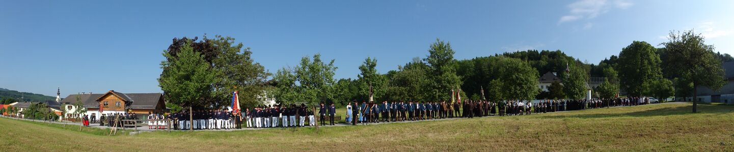 Pfarrbesuch durch Erzbischof Dr. Franz Lackner in Thalgau, die dazu versammelten Thalgauer Vereine in der Pfarrhofallee