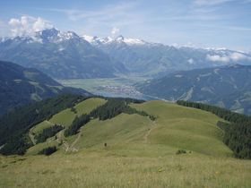 Blick von den Pinzgauer Grasbergem über das Zeller Becken hin zu den Hohen Tauern und ins obere Saalachtal. | |