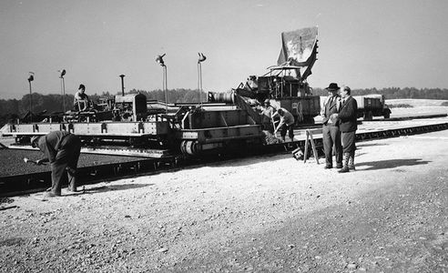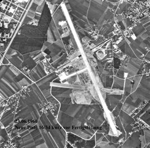 Rechts die erste Betonpiste, die 1960 durch eine neue 16/34 ersetzt wurde, die 2019 erneuert wird. Ganz links der Bau der Flughafenunterführung.