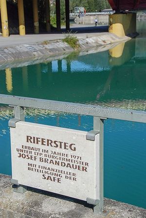 Tafel am Rifersteg. Im Hintergrund erkennt man die Staumauer des Flusskraftwerks Urstein.