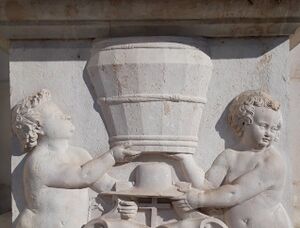 Der Salzburger Landespatron Rupert von Salzburg, der hl. Rupertus, wird mit dem Attribut eines Salzfasses zu seinen Füßen dargestellt.
