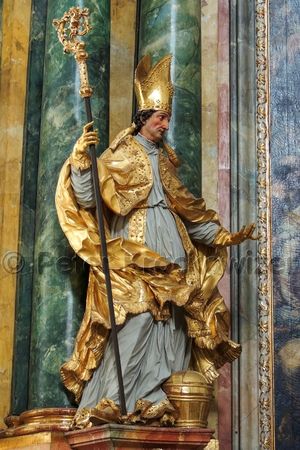Der Salzburger Landespatron Rupert von Salzburg, der hl. Rupertus, wird mit dem Attribut eines Salzfasses zu seinen Füßen dargestellt.