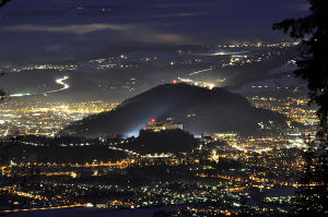 Salzburg liegt im Salzburger Becken. Markant erheben sich daraus in der Mitte mehrere Stadtberge, im Süden der Hellbrunner Berg und die Morzger Hügel.