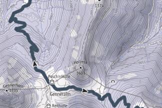 Nach dem knapp einstündigen, eher schattigen Anstieg öffnet sich das sonnige Gebiet der Genneralm (1295 m). Noch vor der Verflachung zweigt ein Hauptast nach rechts (W) in Richtung Gennerhorn (1735 m) ab. Unter guten Bedingungen eine ebenfalls sehr lohnende, wenn auch wesentlich anspruchsvollere Tour.
