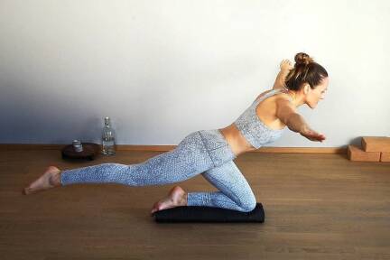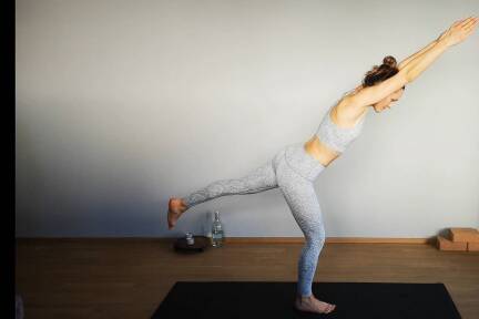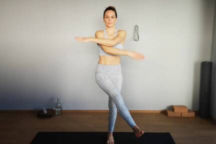 Nach den Einheiten für die Muskulatur von Bauch, Rücken, Rumpf und Wirbelsäule geht es diesmal um etwas ganz anderes: Das Gleichgewichtsgefühl wird geschult. Zuerst stellt man die Füße hintereinander, dann werden die ausgestreckten Arme seitlich, nach unten und nach oben bewegt - das Ganze mit