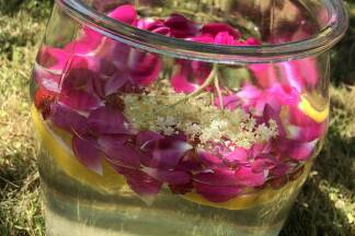 Für so einen Sprudel kann man in 3 Litern Wasser 150 g Zucker, 1 Zitrone in Scheiben, 1/16 Liter Essig, einige Erdbeeren, oder noch besser Walderdbeeren, eine Holunderblüte und Rosenblüten ansetzen. Nur mit einem Tuch zugedeckt, dauert es knapp zwei Tage, bis der Sprudel seinen typischen feinsäuerlichen Geschmack entwickelt hat. Wiederholtes Riechen und Verkosten lässt erkennen, wann er fertig ist. Danach abseihen, in den Kühlschrank stellen und bald trinken.