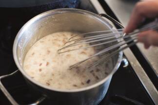 Dann gießen Sie das kochende Wasser über das Brot und den Schotten, geben einen Deckel darüber und lassen den Inhalt einige Minuten ziehen. Dann gut mit einem Schneebesen verrühren und den Rahm und das Salz dazugeben. Fertig.