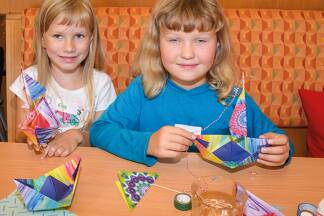 Alles entsteht immer nur aus so bezeichneten Berg- und Talfalten, jeweils gleichzeitig, egal wie komplex die Figur am Ende ist. "Wichtig ist immer das Umdrehen, das Wenden in die richtige Richtung, damit die ins Auge gefasste Figur funktioniert. Aber es gibt auch keine Fehler, denn es entsteht dann halt etwas anderes", sagt die Künstlerin. Zu den Grundformen Quadrat oder zusammengeschobenes Quadrat, aus denen verschiedene Modelle oder auch ein Dreieck werden können, gehören auch Blintzformen, wie bei "Himmel und Hölle", wo alle vier Ecken immer zur Mitte gefaltet werden, oder Windmühlen und Vogel-Grundformen. "Einzig das Schiff entsteht nicht aus einer Grundform, das hat eine spezielle Faltform, die sonst nirgendwo vorkommt." Nötig sind dafür weder Kunstfertigkeit noch ein Übermaß an Durchhaltevermögen, denn das Falten und Entdecken vieler neuer Formen verschafft reichlich Glücksmomente, die Belohnung entsteht schon während der Tätigkeit. "Man darf sich nur nicht überfordern und muss anfangs mit kleineren Dingen beginnen", erklärt die gelernte Grafikdesignerin und Kreativtrainerin, die aktuell in der Sozialarbeit tätig ist.