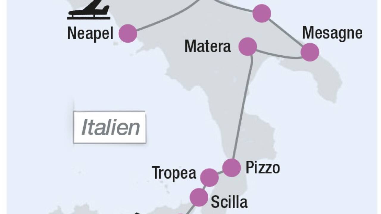 Sie erleben eine Reise in der Gegenwart mit stetem Blick auf die Vergangenheit. So stellen die zauberhaften "Trulli" von Alberobello ein beeindruckendes Zeugnis des einstigen Landlebens dar, während zahlreiche Schlösser auf eine Zeit zurückblicken, in denen das Meer reich an Abenteuern war. Die "Stiefelspitze" Kalabrien, umspült vom klaren, türkisblauen Wasser des Ionischen und Tyrrhenischen Meeres entführt Sie in eine wilde Landschaft mit versteckten Buchten und felsigen Küsten.