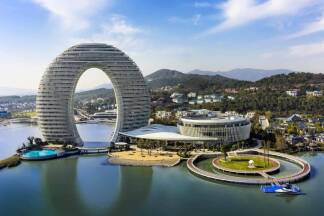Bleibt halt immer noch die alte Sehnsucht nach dem Mond. Ein klein wenig davon lässt sich im chinesischen Huzhou stillen. Das dortige Sheraton Hot Spring Resort aus zwei gebogenen Türmen wirft die Umrisse eines Mondes auf die Oberfläche des Taihu-Sees. Und ganz Schlaue blicken in einer klaren Nacht einfach nach oben.
