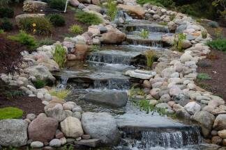 Ist wenig Platz, dann kann mit diesem glucksenden Wasserelement auch auf kleinstem Raum naturnahe Stimmung geschaffen werden. Wichtig sind ein nicht zu starkes Gefälle, eine kräftige Pumpe und ein großer (unterirdischer) Wasserspeicher. Randbepflanzung mit überdeckenden Blättern wie Frauenmantel oder im Halbschatten mit Farnen bringt einen natürlichen Charakter.